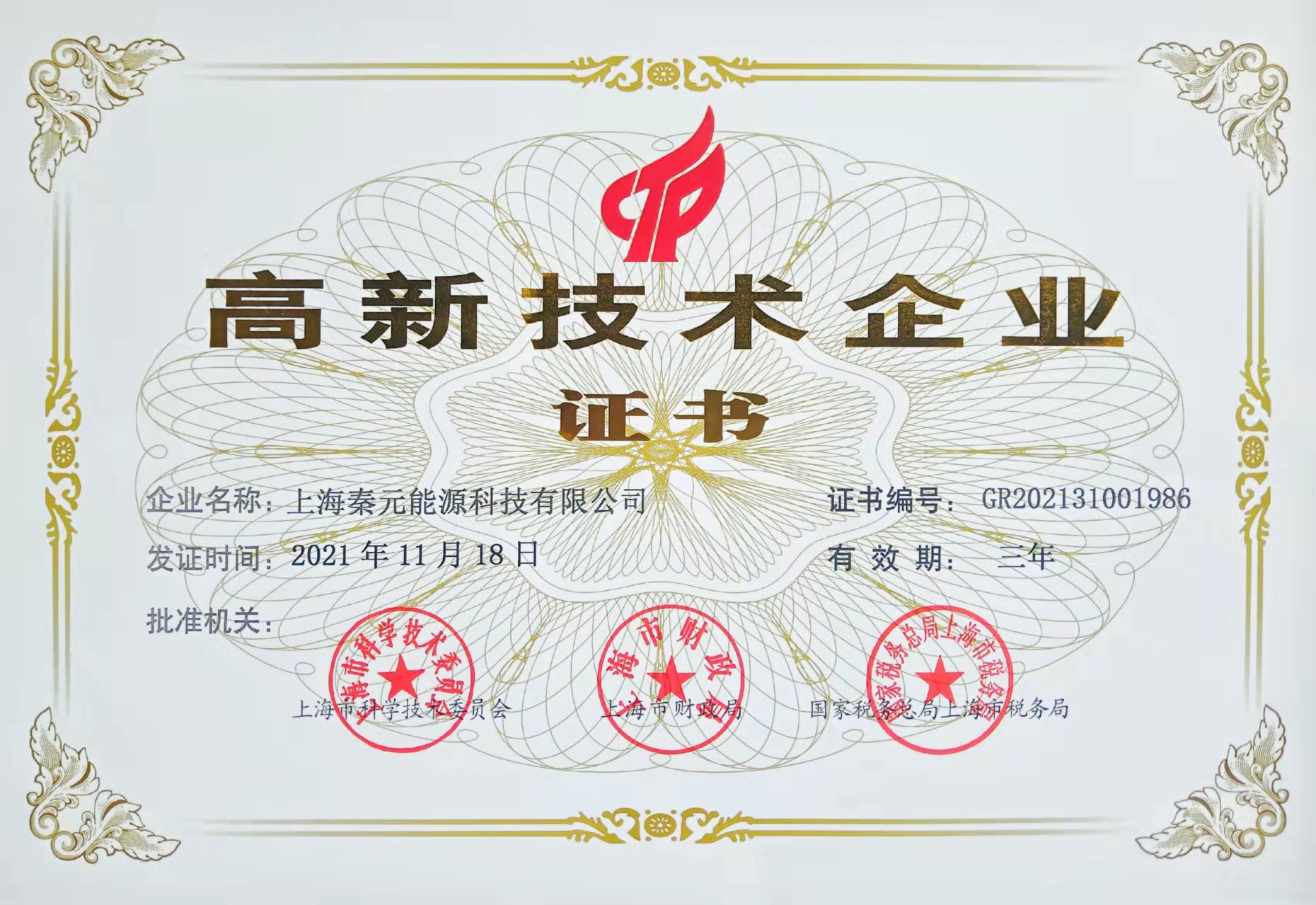 喜訊!2022年3月4日上海秦元能源科技有限公司獲得 “高新技術(shù)企業(yè)”證書,證書編號(hào):GR202131001986。
