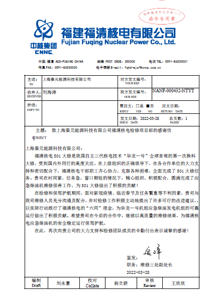 主題:致上海秦元能源科技有限公司福清核電檢修項目部的感謝信: