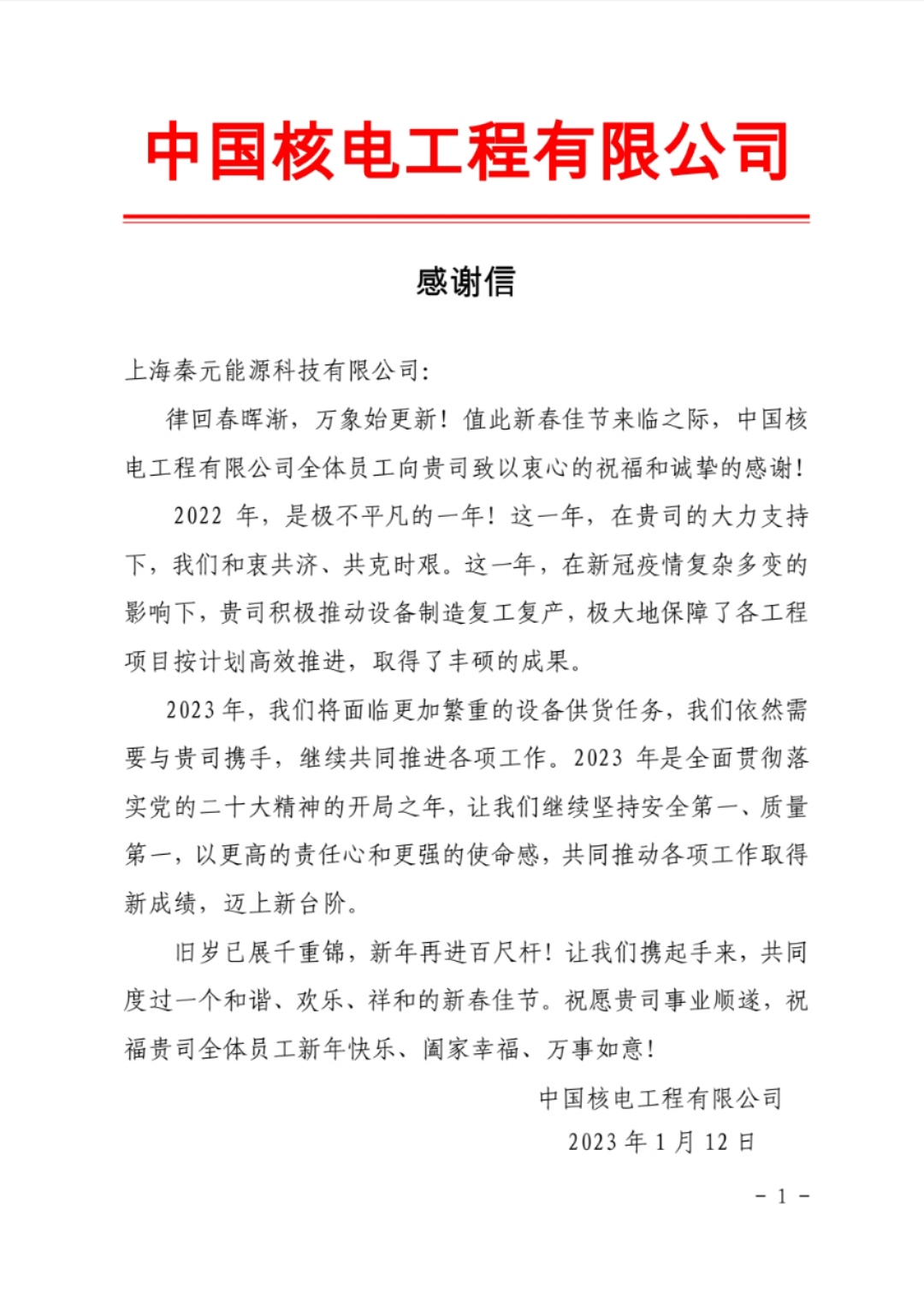 在2023年春節(jié)來臨之際,我公司收到來自 中國核電工程有限公司 的感謝信,信中對我公司2022年的工作給與了極高的評價和鼓勵,客戶的認(rèn)可是對我們工作的最大褒獎和鞭策。在此,非常感謝中國核電工程有限公司對我公司的信任和支持,今后我們將一如既往地做好供貨服務(wù),以回饋所有新老客戶!