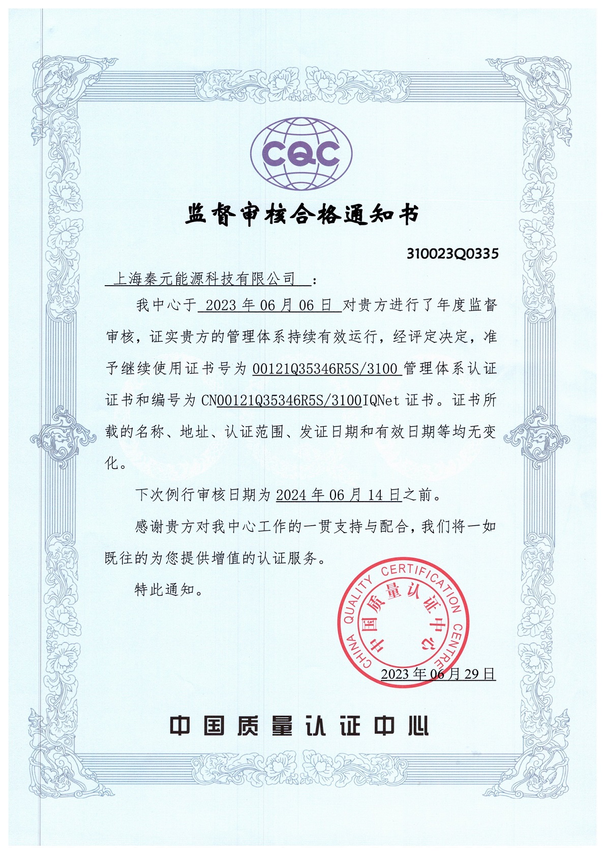 秦元公司獲得2023年度CQC監(jiān)督審核合格通知書